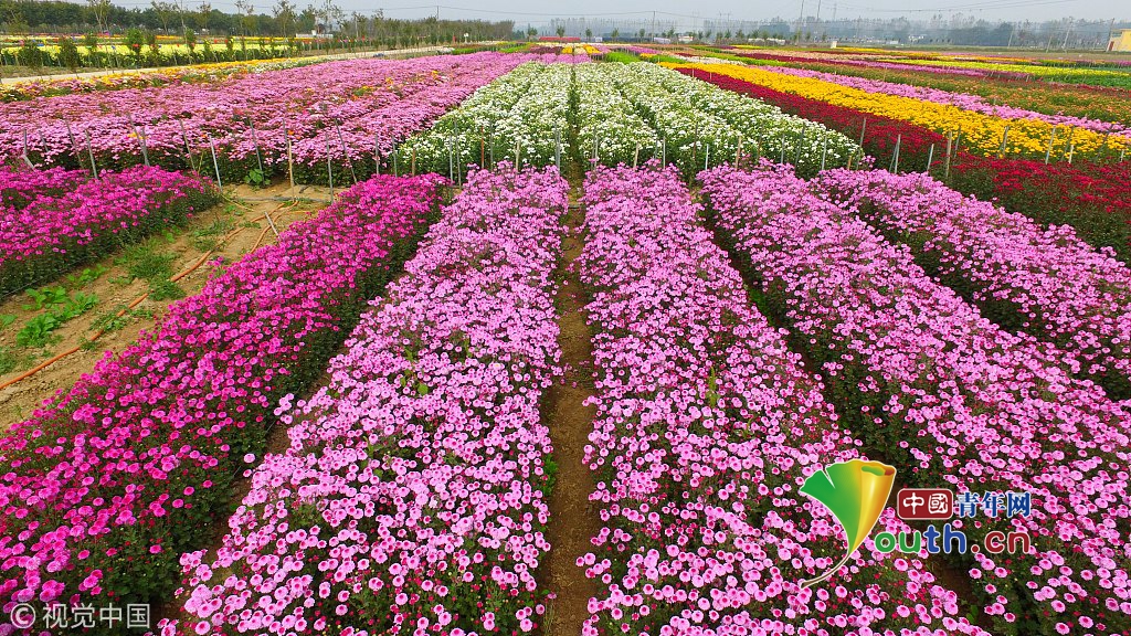 河南許昌觀賞彩菊綻放如五彩地毯 航拍展現(xiàn)震撼美