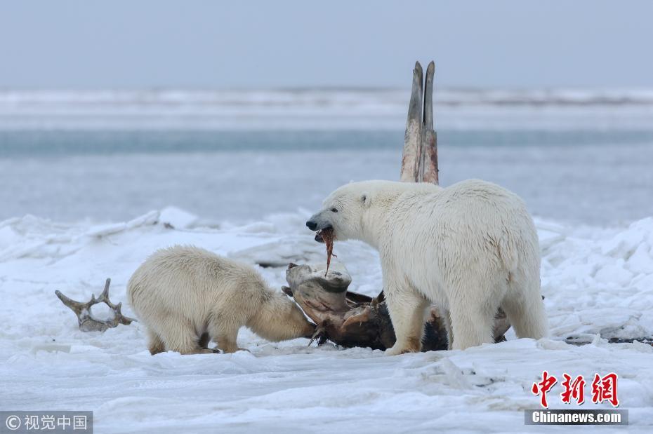 11月1日訊(具體拍攝時(shí)間不詳),美國(guó)阿拉斯加州,一只北極熊媽媽帶著幼崽們外出覓食,發(fā)現(xiàn)了一節(jié)長(zhǎng)4.5米的北極露脊鯨骸骨。75噸重的鯨魚(yú)對(duì)因紐皮亞特人來(lái)說(shuō)是神圣的,他們每年要吃三次鯨魚(yú),把骨頭放在指定的地方,讓北極熊吃完粘在骨頭上的碎肉。攝影師Eiji Itoyama為拍攝此照片在位于北冰洋邊緣的阿拉斯加卡克托維克村停留了5天。圖片來(lái)源:視覺(jué)中國(guó)