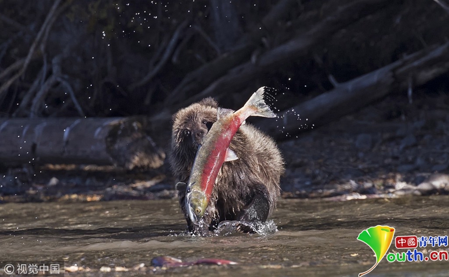 小棕熊成功捉到紅色鮭魚(yú)。