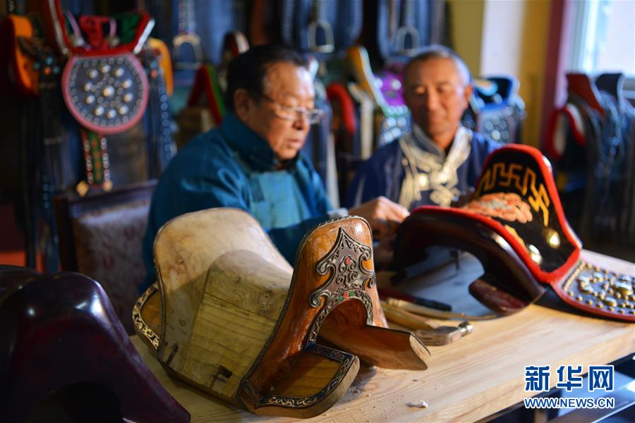 10月31日,在內(nèi)蒙古自治區(qū)通遼市科爾沁左翼后旗,套格敦白乙(左)向徒弟關嘎扎布傳授制作馬鞍的技巧。新華社記者鄒予攝