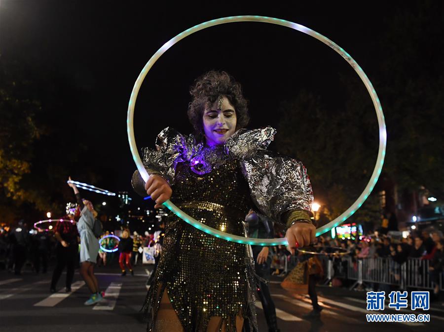 10月31日,在美國紐約曼哈頓,一名女子參加萬圣節(jié)大游行。