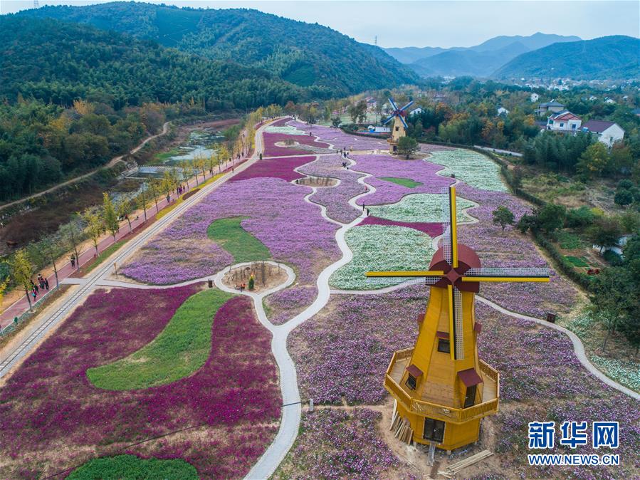 11月2日,空中俯瞰小浦鎮(zhèn)的“五彩花?!?,多彩的花海與金黃的銀杏林構(gòu)成了一幅美麗的秋季風(fēng)景(無人機(jī)拍攝)。 新華社記者 徐昱 攝