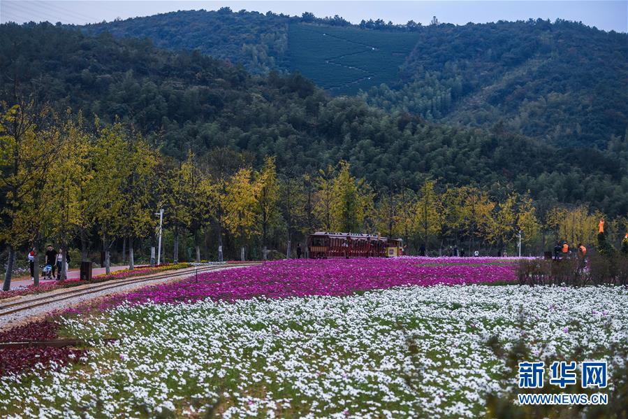 11月2日,游客乘坐觀光小火車觀賞“五彩花海”(無人機(jī)拍攝)。
