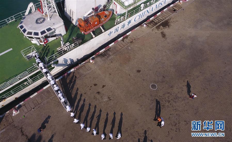 11月3日,海事執(zhí)法人員登上“海巡21”輪(無人機(jī)拍攝)。 當(dāng)日,隨著“海巡21”輪緩緩駛離海口海事監(jiān)管基地碼頭,由瓊桂粵海事部門共同開展的瓊州海峽、北部灣及環(huán)海南島水域跨轄區(qū)聯(lián)合巡航執(zhí)法活動揭開序幕。 新華社記者楊冠宇攝