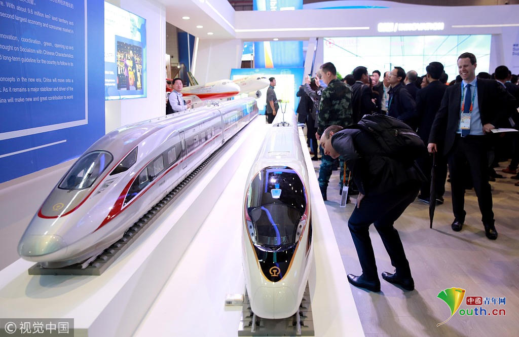2018年11月6日,上海,首屆中國國際進口博覽會國家展上,共有82個國家、3個國際組織設立了71個展臺。中國館展示的復興號。視覺中國