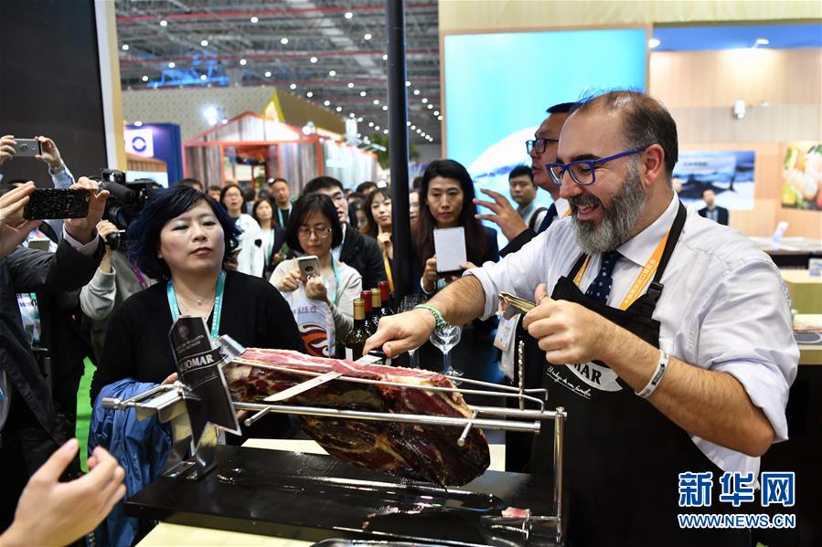 11月6日,西班牙火腿展商何塞(右)向參觀者提供伊比利亞黑豬火腿。