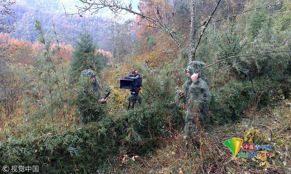 2013年11月6日,兩歲兩個(gè)月的雌性大熊貓“張想”在四川省雅安栗子坪自然保護(hù)區(qū)進(jìn)行放歸,記者“全副武裝”在現(xiàn)場(chǎng)采訪。(手機(jī)拍攝)圖片作者:衡毅/視覺(jué)中國(guó)