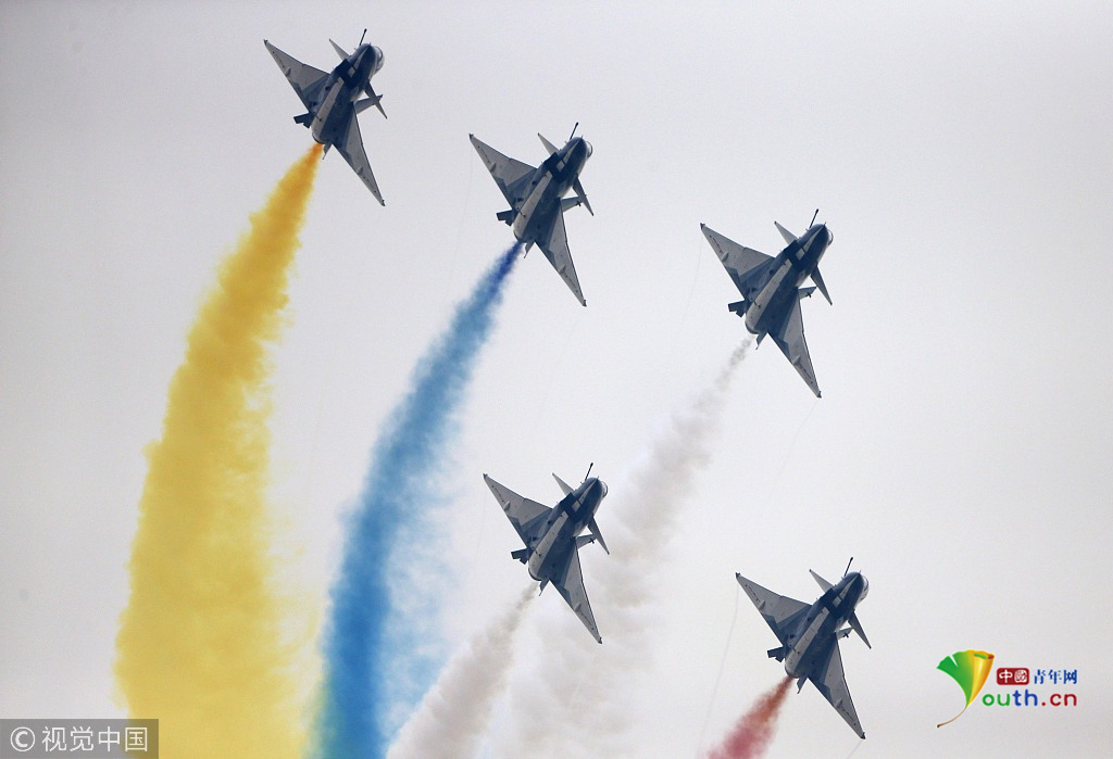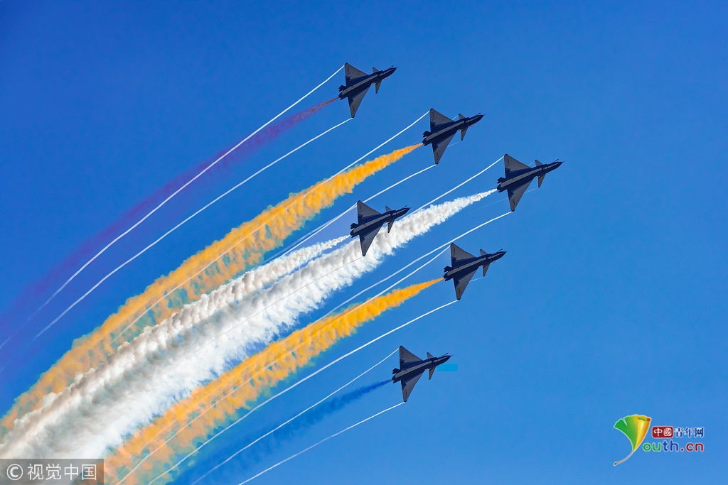 2018年11月8日,廣東珠海,第十二屆中國國際航展第三天??哲姟鞍艘弧憋w行表演隊的隊員們,發(fā)揚連續(xù)作戰(zhàn)精神,給觀眾們表演了七機分組開花、四機編隊橫滾等高難動作,受到觀眾們的稱贊。視覺中國