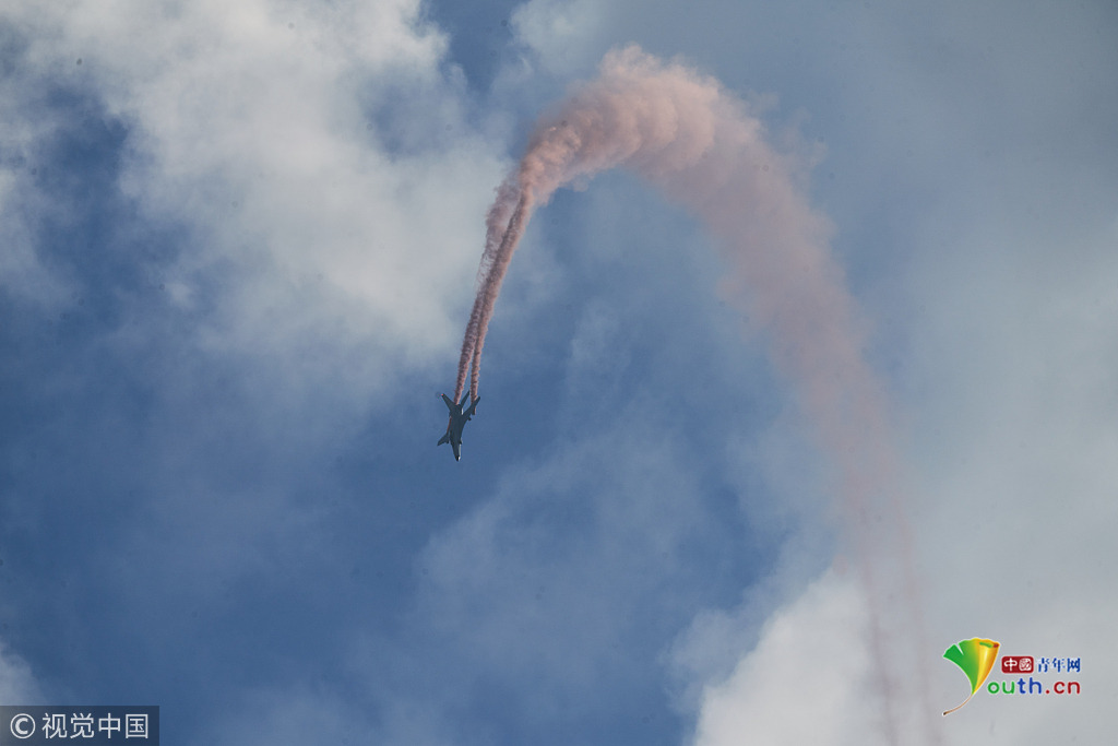 2018年11月7日,空軍紅鷹隊在廣東省珠海市第十三屆中國航空航天博覽會上進行飛行表演。視覺中國