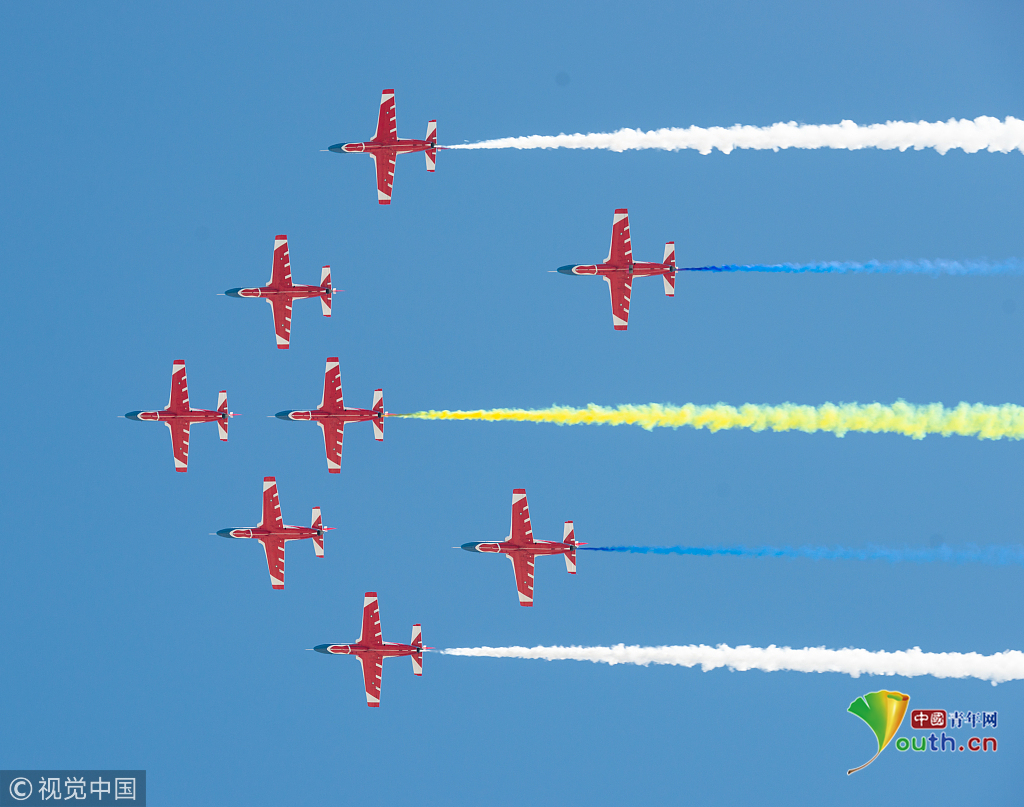2018年11月7日,廣東珠海,第12屆珠海航展在金灣機場如火如荼進行。空軍航空大學(xué)“紅鷹”飛行表演隊在第十二屆中國航展進行了飛行表演,展示了飛行員精湛的飛行技能。視覺中國