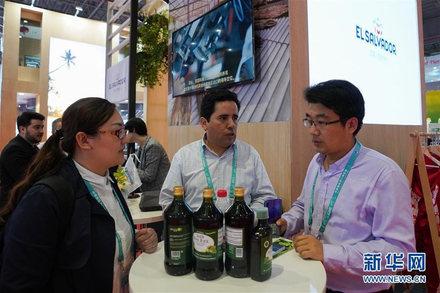 11月7日,在薩爾瓦多展區(qū),一名參觀者(左)聽取工作人員推介當?shù)厣a(chǎn)的諾麗果汁。 中國國際進口博覽會11月5日在上海開幕。國家貿易投資綜合展(國家展)是中國國際進口博覽會的重要內容,共有82個國家、3個國際組織設立71個展臺。 新華社記者 王天聰 攝