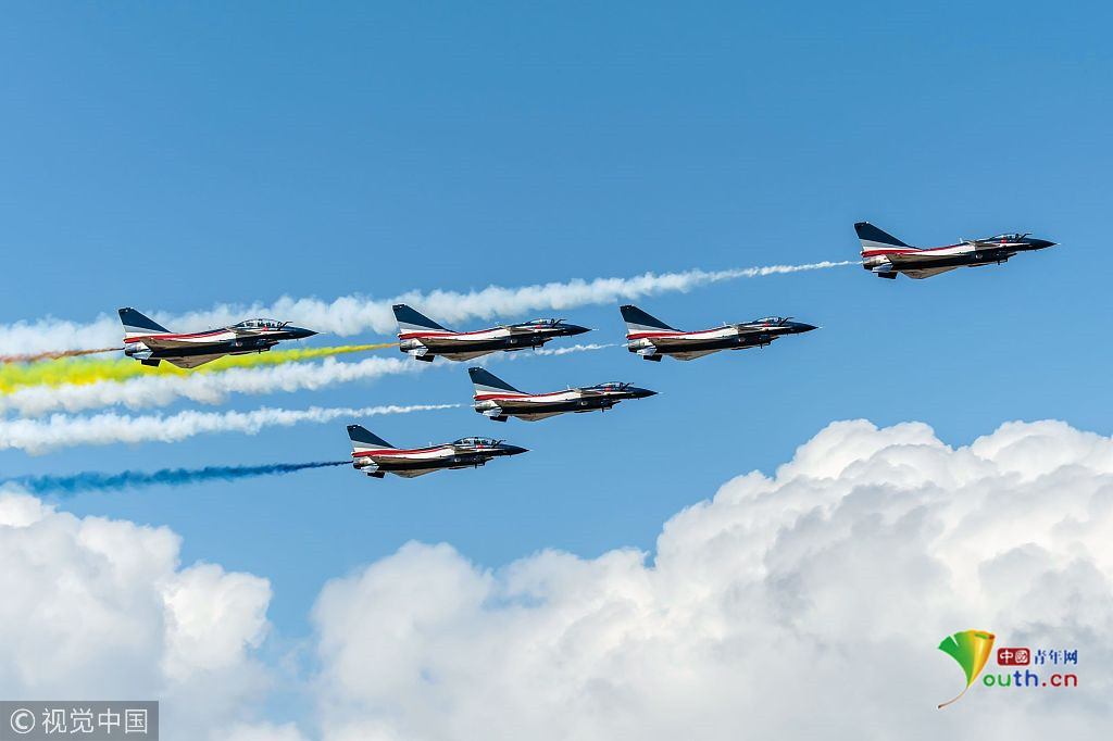 2018年11月8日,廣東珠海,第十二屆中國國際航展第三天??哲姟鞍艘弧憋w行表演隊(duì)的隊(duì)員們,發(fā)揚(yáng)連續(xù)作戰(zhàn)精神,給觀眾們表演了七機(jī)分組開花、四機(jī)編隊(duì)橫滾等高難動作,受到觀眾們的稱贊。視覺中國