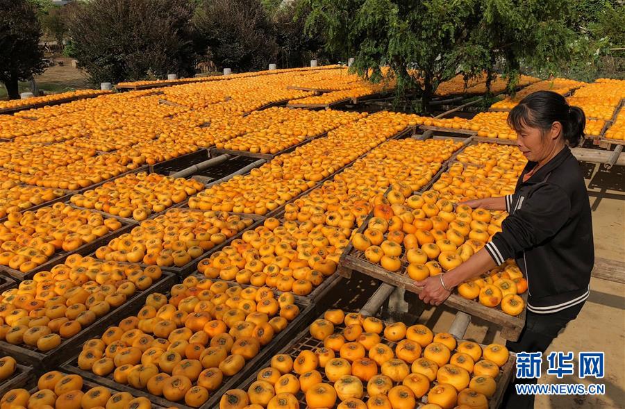 10月17日,廣西桂林市平樂縣沙子鎮(zhèn)渡河村農民在晾曬柿子(手機拍攝)。 金秋時節(jié),農民們忙著收獲成熟的農作物,喜迎豐收。 新華社記者 黃孝邦 攝