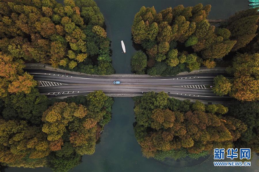11月13日,一艘游船在杭州西湖上行駛(無人機拍攝)。 時值初冬,杭州市西湖景區(qū)層林盡染,色彩斑斕,別有一番韻味。