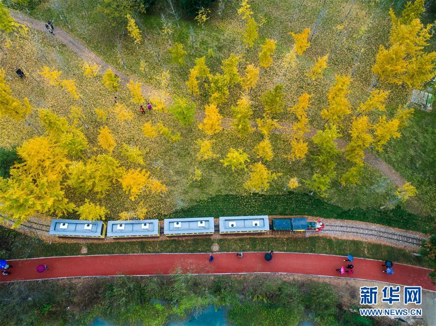 一列觀光小火車帶著游客穿行在銀杏林里(11月16日無人機(jī)拍攝)。近日,在浙江省長興縣小浦鎮(zhèn),“十里銀杏長廊”和近千畝花海經(jīng)過近一年的升級改造后,以嶄新的面貌與游客見面。花海、觀光小火車、古村民宿、銀杏長廊等旅游項目全面提升了小浦鎮(zhèn)鄉(xiāng)村旅游的品質(zhì)。新華社記者 徐昱 攝