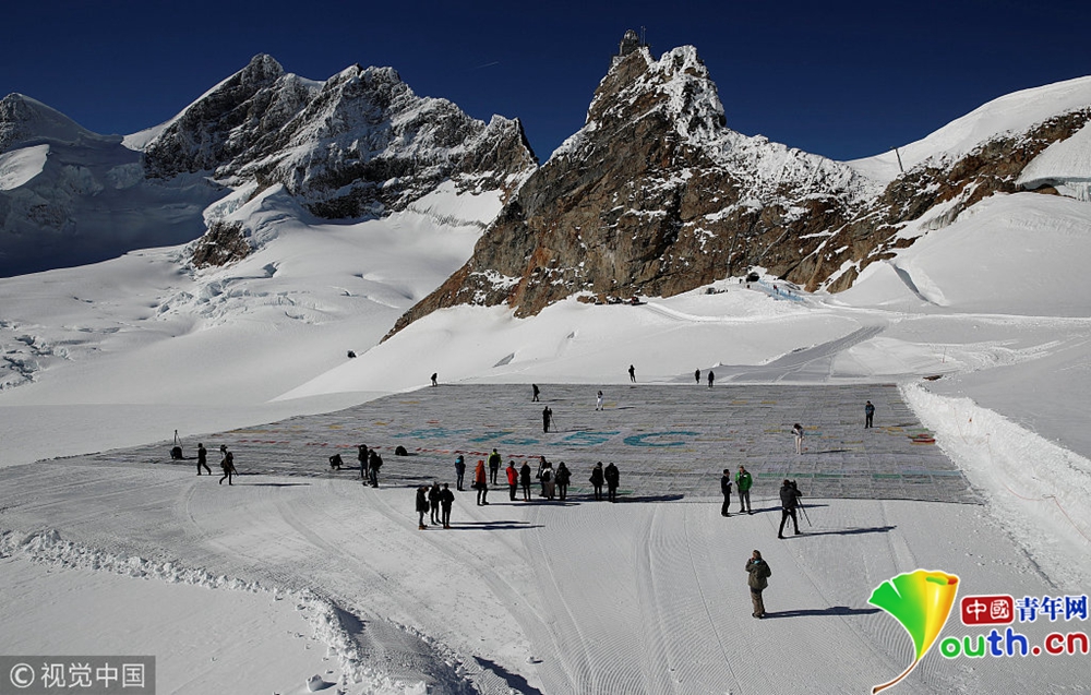 一張面積約2500平方米的世界最大明信片16日在瑞士少女峰下正式亮相,旨在喚起人們對全球氣候變化的關(guān)注。這張明信片的尺寸打破吉尼斯紀(jì)錄。新華社記者徐金泉攝