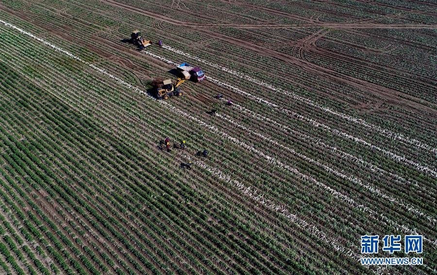 黃驊市常郭鎮(zhèn)一種植專業(yè)合作社社員在收獲白蘿卜(11月19日無人機拍攝)。 新華社記者 楊世堯 攝