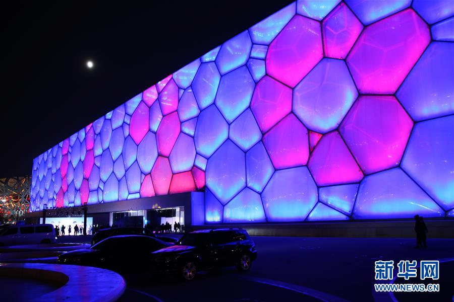 11月20日,在北京舉行的世界兒童日主題活動(dòng)上,國(guó)家游泳中心外墻被點(diǎn)亮。 新華社記者張玉薇攝