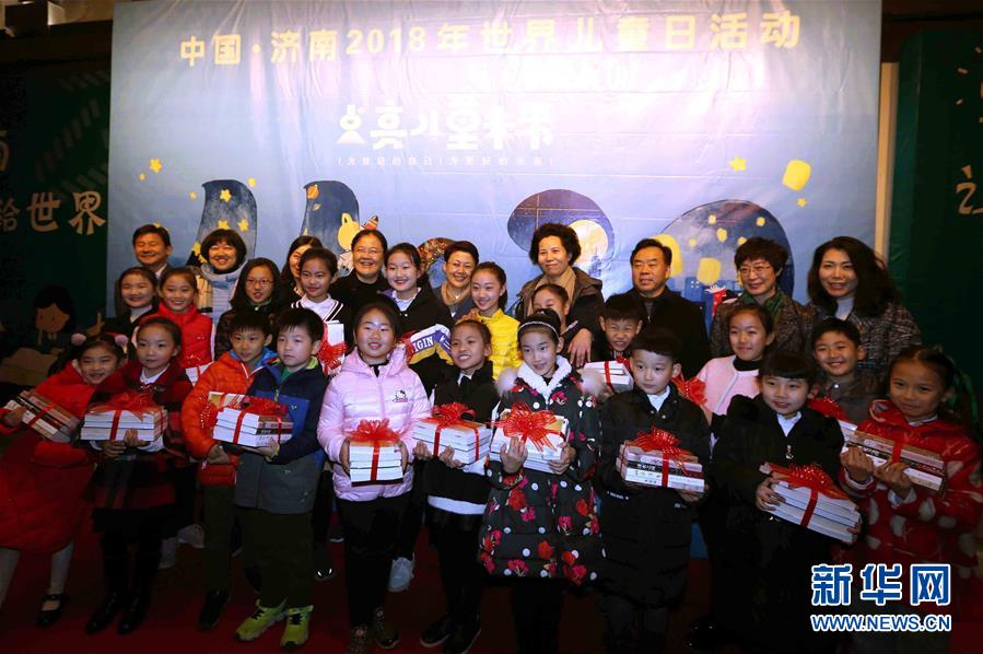11月20日,在濟(jì)南舉行的世界兒童日主題活動(dòng)上,孩子們拿著獲贈(zèng)的經(jīng)典書籍合影留念。 新華社發(fā)(李俊卓攝)