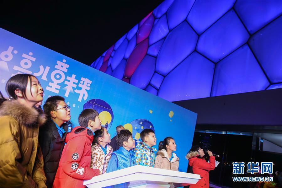 11月20日,在北京舉行的世界兒童日主題活動(dòng)上,孩子們共同點(diǎn)亮國(guó)家游泳中心外墻。 新華社記者張玉薇攝