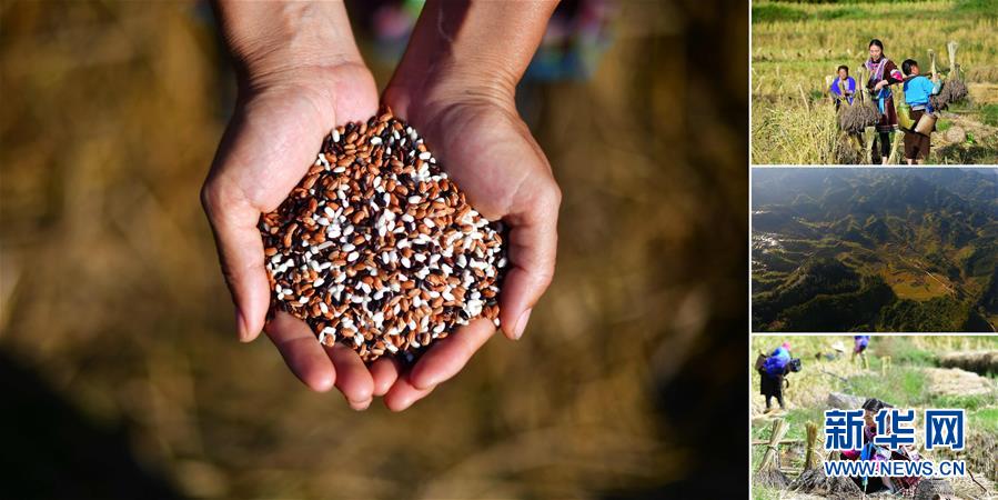 拼版照片:左圖為在安太鄉(xiāng)元寶村,合作社負責人謝秀萍手捧今年收獲的三色香糯;右上圖為合作社負責人謝秀萍(中)和社員們在收香糯;右中圖為位于苗山深處的香糯種植基地;右下圖為謝秀萍在收香糯(照片均攝于10月30日)。謝秀萍是當?shù)叵闩捶N植合作社負責人,帶動幾百戶貧困戶種植香糯。香糯是廣西融水大苗山的特產(chǎn),它生長在高寒高海拔的特殊自然環(huán)境中,產(chǎn)量少,營養(yǎng)價值高。 廣西融水苗族自治縣是國家扶貧工作重點縣,全縣“九山半水半分田”,生活生產(chǎn)環(huán)境較為惡劣,脫貧攻堅任務(wù)艱巨,目前還有7.68萬貧困人口。面對經(jīng)濟發(fā)展落后、貧困面廣且程度深的現(xiàn)狀,當?shù)匕衙撠毠耘c創(chuàng)新產(chǎn)業(yè)扶持相結(jié)合,依托生態(tài)資源優(yōu)勢,實施“特色產(chǎn)業(yè)富民行動”,通過發(fā)展特色民族旅游、林下經(jīng)濟和特色養(yǎng)殖業(yè)等扶貧產(chǎn)業(yè),帶動貧困群眾依靠勤勞的雙手,拔窮根摘窮帽,實現(xiàn)脫貧致富。據(jù)了解,目前全縣貧困戶參與特色產(chǎn)業(yè)發(fā)展的有2.9萬戶,扶貧產(chǎn)業(yè)覆蓋率達95%。 新華社記者 黃孝邦 攝