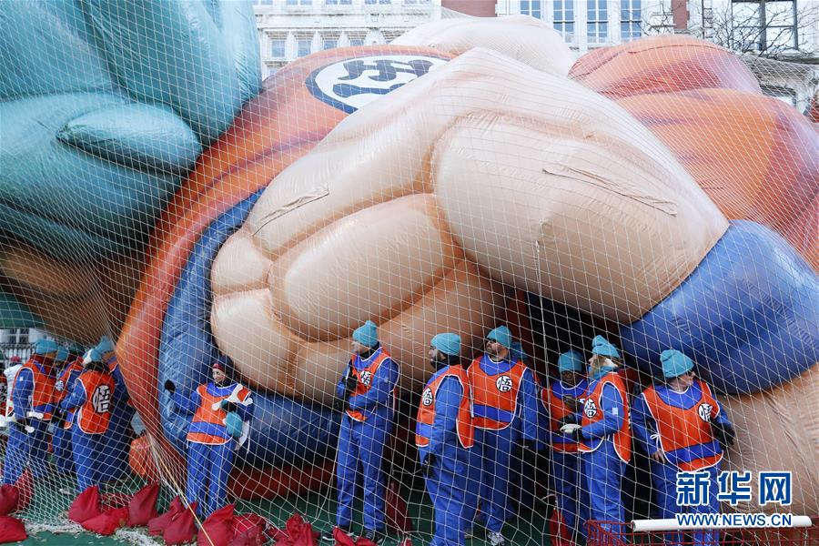 11月22日,在美國(guó)紐約感恩節(jié)大游行開始前,氣球操縱人員進(jìn)行準(zhǔn)備工作。