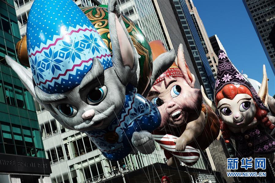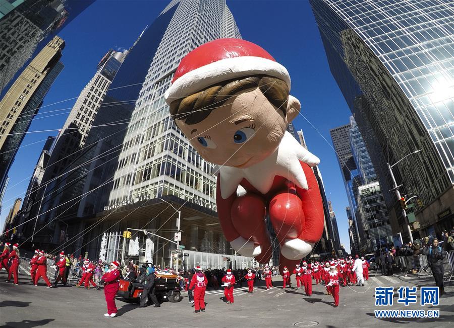 11月22日,在美國(guó)紐約感恩節(jié)大游行上,小精靈造型氣球行進(jìn)在曼哈頓街頭。