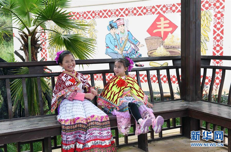在尋甸回族彝族自治縣塘子街道小海村,兩名小女孩在村里的休閑亭玩耍(9月30日攝)。國(guó)慶節(jié)期間,云南省尋甸回族彝族自治縣塘子街道小海村一片喜慶祥和。人們身著節(jié)日盛裝,載歌載舞,歡慶搬入新居后的第一個(gè)國(guó)慶節(jié)。新華社記者楊宗友攝