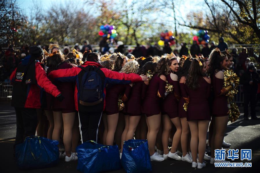 11月22日,在美國(guó)紐約感恩節(jié)大游行開始前,演員們抱團(tuán)取暖。