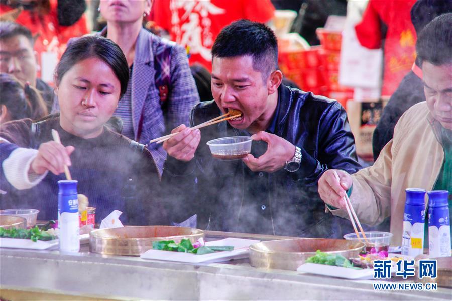 10月19日,食客們圍坐在一口特大火鍋前品嘗。 當(dāng)日,第十屆中國(guó)(重慶)火鍋美食文化節(jié)在重慶市江北區(qū)正式開幕。本屆火鍋美食文化節(jié)為期4天,以“麻辣happy城市節(jié)日”為主題,50000平方米的展區(qū)吸引了70余個(gè)火鍋品牌、300余家火鍋供應(yīng)鏈企業(yè)參展,萬(wàn)人同燙火鍋的盛況在“火鍋之都”重慶再現(xiàn)。 新華社記者 劉潺 攝