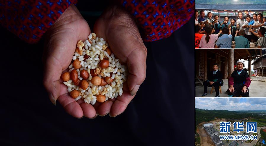 拼版照片:左圖為在廣西融水雙龍溝森林旅游度假區(qū)夢嗚苗寨,70歲的韋院媽手捧油茶原料:花生、油果、蔭米(11月20日攝);右上圖為韋院媽(左六)在景區(qū)里和游客們一起歡度苗族新禾節(jié)(7月18日攝);右中圖為韋院媽(右)在家里休息(11月20日攝);右下圖為夢嗚苗寨(7月19日無人機拍攝)。韋院媽是桿洞鄉(xiāng)錦洞村的貧困戶,今年3月,她和村里的13戶貧困戶一起舉家搬到雙龍溝森林旅游度假區(qū)打造的夢嗚苗寨,景區(qū)將貧困戶引入苗寨生活工作,保證貧困家庭有穩(wěn)定的收入。 廣西融水苗族自治縣是國家扶貧工作重點縣,全縣“九山半水半分田”,生活生產(chǎn)環(huán)境較為惡劣,脫貧攻堅任務艱巨,目前還有7.68萬貧困人口。面對經(jīng)濟發(fā)展落后、貧困面廣且程度深的現(xiàn)狀,當?shù)匕衙撠毠耘c創(chuàng)新產(chǎn)業(yè)扶持相結(jié)合,依托生態(tài)資源優(yōu)勢,實施“特色產(chǎn)業(yè)富民行動”,通過發(fā)展特色民族旅游、林下經(jīng)濟和特色養(yǎng)殖業(yè)等扶貧產(chǎn)業(yè),帶動貧困群眾依靠勤勞的雙手,拔窮根摘窮帽,實現(xiàn)脫貧致富。據(jù)了解,目前全縣貧困戶參與特色產(chǎn)業(yè)發(fā)展的有2.9萬戶,扶貧產(chǎn)業(yè)覆蓋率達95%。 新華社記者 黃孝邦 攝