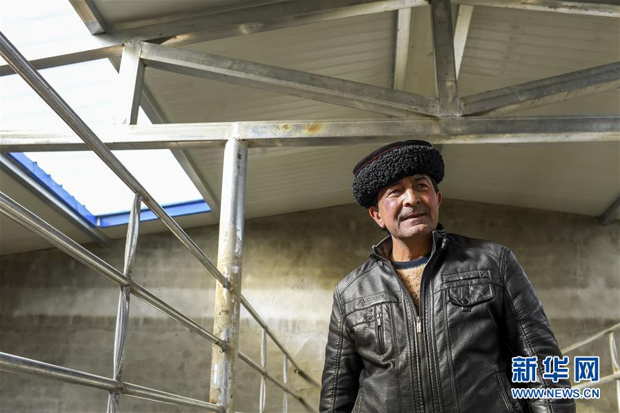 在塔什庫爾干塔吉克自治縣塔提庫力易地扶貧搬遷安置點,都熱·加爾曼在新修的標準化棚圈內參觀(11月18日攝)。新華社記者胡虎虎攝