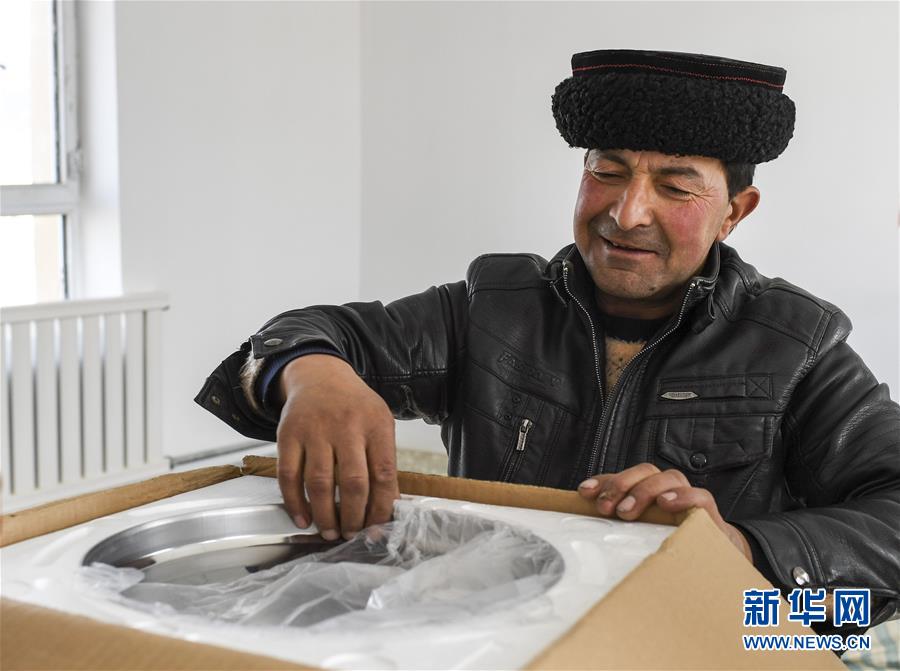 在塔什庫爾干塔吉克自治縣塔提庫力易地扶貧搬遷安置點的新房內,都熱·加爾曼領取免費發(fā)放的電飯鍋(11月18日攝)。新華社記者胡虎虎攝