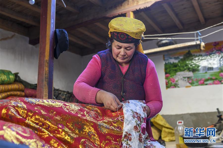 在塔什庫爾干塔吉克自治縣大同鄉(xiāng)阿克托尕欄桿村一組都熱的舊居中,都熱·加爾曼的妻子在縫制新被子,為搬遷新居做準備(11月13日攝)。新華社記者胡虎虎攝