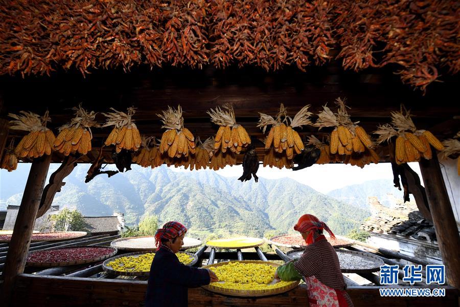 2017年10月26日,篁嶺村村民在晾曬皇菊。近日天氣晴朗,江西省婺源縣江灣鎮(zhèn)篁嶺村村民抓住時機(jī)采摘、晾曬皇菊及蔬果。明黃的菊花、火紅的辣椒……各種顏色將篁嶺古村裝扮成巨大的“調(diào)色板”,引來眾多游客感受鄉(xiāng)村美景。新華社記者宋振平 攝