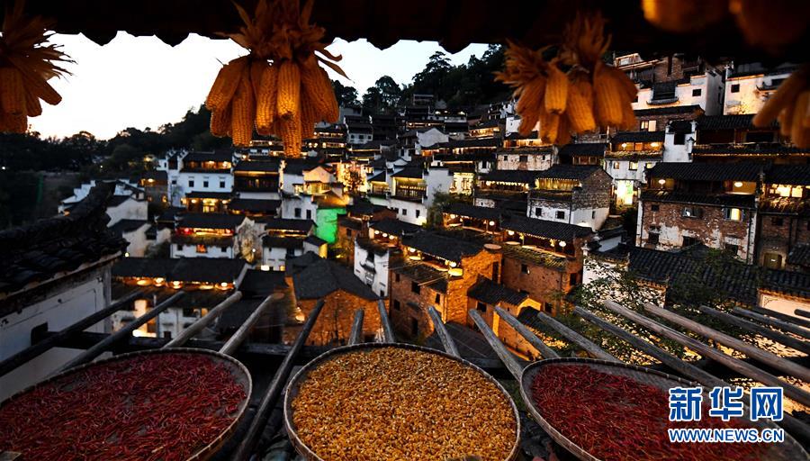 這是黃昏中的篁嶺古村(10月25日攝)。近日天氣晴朗,江西省婺源縣江灣鎮(zhèn)篁嶺村村民抓住時機(jī)采摘、晾曬皇菊及蔬果。明黃的菊花、火紅的辣椒……各種顏色將篁嶺古村裝扮成巨大的“調(diào)色板”,引來眾多游客感受鄉(xiāng)村美景。新華社記者宋振平 攝