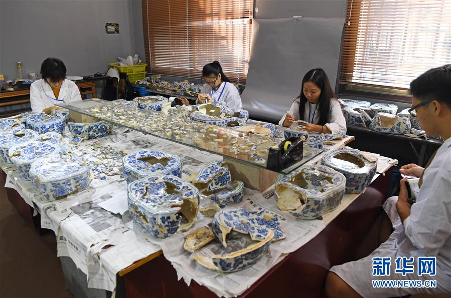 在江西景德鎮(zhèn)御窯廠遺址,工作人員正在修復(fù)明代瓷枕(9月20日攝)。 新華社記者 萬象 攝