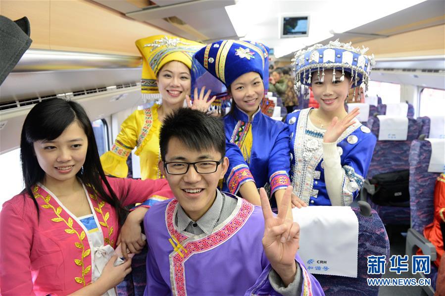 在廣西南寧站,身著民族服裝的乘客搭乘動車準(zhǔn)備出行(2013年12月30日攝)。 廣西壯族自治區(qū)成立60年來,鐵路建設(shè)發(fā)生翻天覆地的變化。來自中國鐵路南寧局集團(tuán)有限公司的數(shù)據(jù)顯示,1958年廣西鐵路總里程為1346.3公里,如今廣西鐵路總里程達(dá)5191公里。廣西與周邊相鄰省份間實現(xiàn)動車“公交化”開行。此外,北部灣港—重慶班列、東盟海產(chǎn)品冷鏈班列、“百色一號”果蔬專列等的開通和運營,強化了鐵路供給的針對性和有效性。鐵路成為助推廣西經(jīng)濟(jì)社會快速發(fā)展的“大動脈”。 新華社記者周華攝