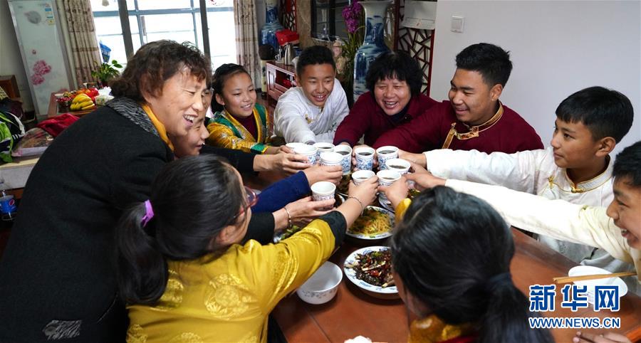 11月16日,南昌市第十七中學(xué)西藏班的學(xué)生來(lái)到劉和平(后排右四)家中吃飯。新華社記者 胡晨歡 攝