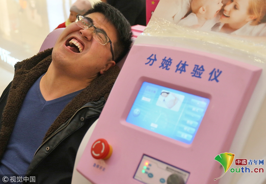 2018年3月8日,一名男士在山東煙臺(tái)大悅城通過(guò)“分娩體驗(yàn)儀”感受“分娩”時(shí)的陣痛。