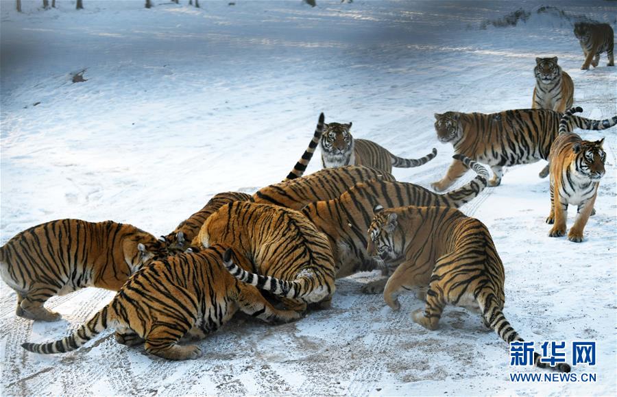 在橫道河子?xùn)|北虎林園散放區(qū),一群東北虎在搶食投放的活雞(11月21日攝)。新華社記者王建威攝