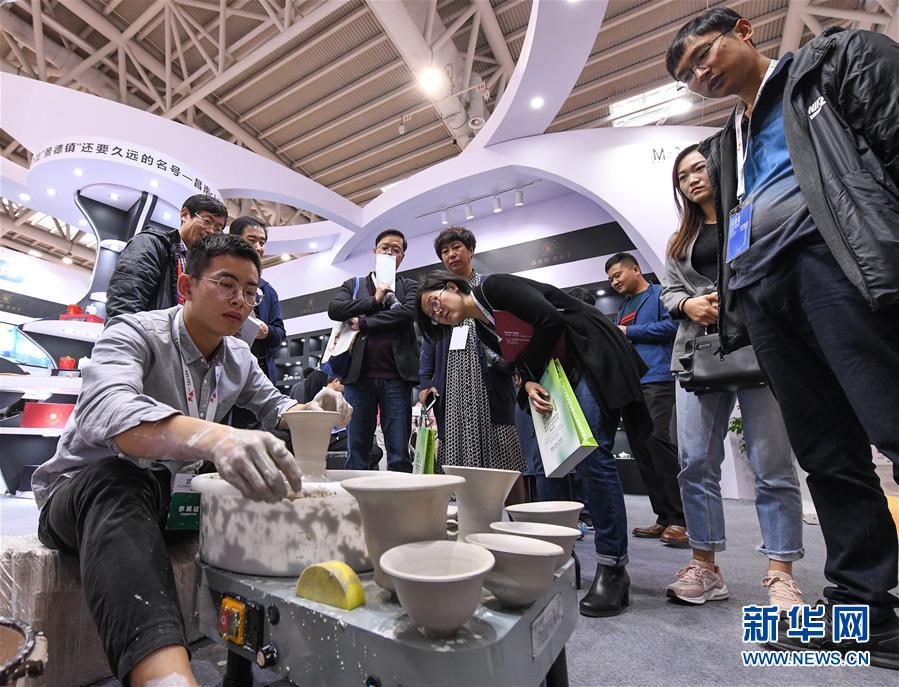 11月23日,景德鎮(zhèn)中國陶瓷博物館展位上的技師在向參觀者展示瓷器制作中的制坯工藝。新華社記者李賀攝