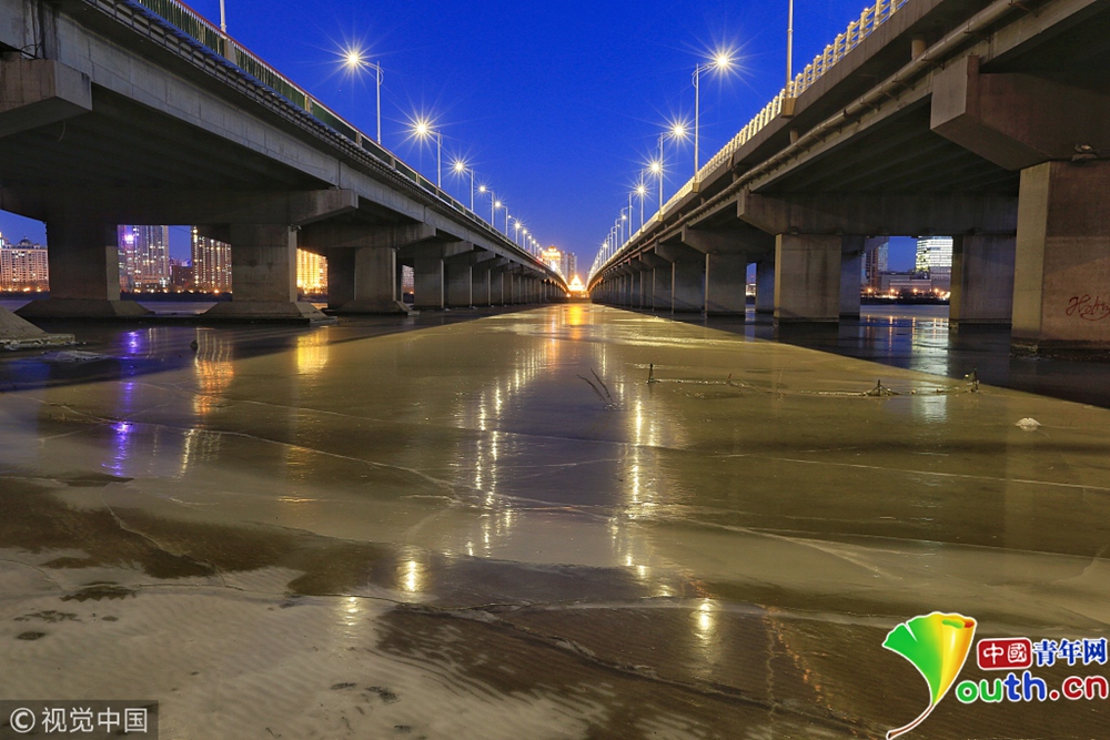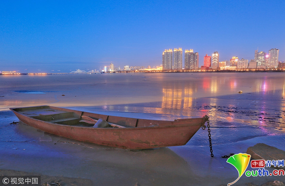 11月23日,黑龍江省哈爾濱市,松花江城區(qū)江段今日封江,江面如鏡,倒影著冰城靚麗的夜色。