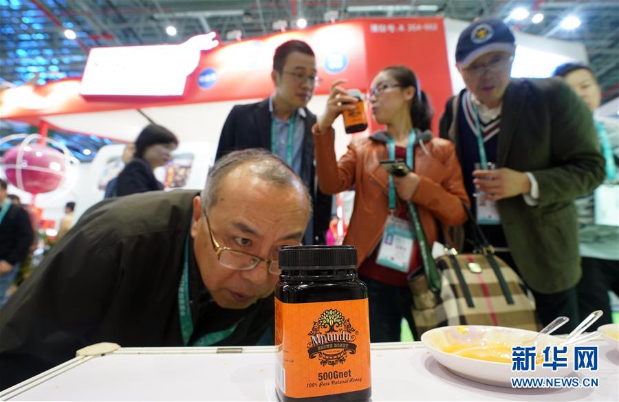 在首屆中國(guó)國(guó)際進(jìn)口博覽會(huì)上,參觀者在睦朋得野生蜂蜜有限公司展臺(tái)觀看蜂蜜展品(11月8日攝)。  新華社記者 程麗 攝