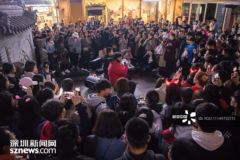 2018年4月6日晚,清明小長假的第二天,在山東省濟(jì)南市復(fù)古老街區(qū)寬厚里,暫停演出有段時日的網(wǎng)紅歌唱組合“連音社”悄然復(fù)出,吸引了當(dāng)?shù)匾约皝碜匀珖鞯赜慰偷膰^。