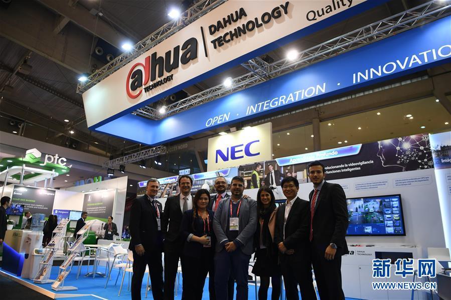 2017年11月15日,在巴塞羅那2017全球智慧城市博覽會(huì)上,浙江大華技術(shù)股份有限公司的中外員工在本公司展臺(tái)前合影。新華社記者郭求達(dá)攝