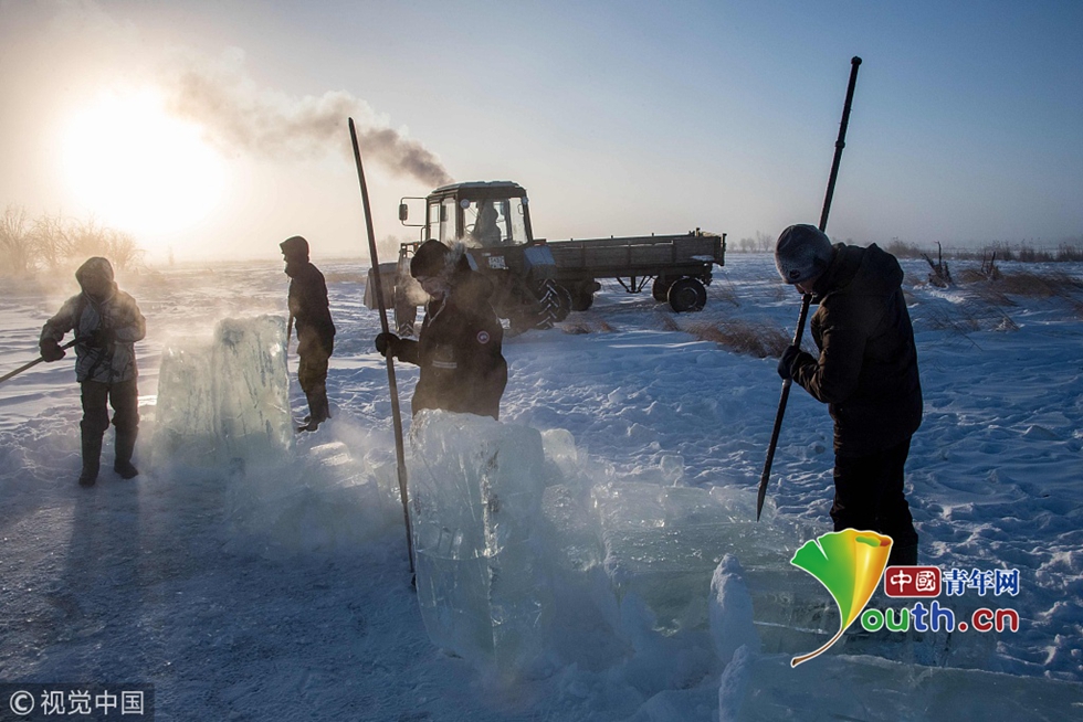 當(dāng)?shù)貢r間2018年11月27日,雅庫茨克,零下41攝氏度左右的氣溫下,村民在當(dāng)?shù)氐囊粋€湖中采集冰塊。當(dāng)?shù)睾芏嗳艘蕾囉谌诨鶋K解決供水,因為多年凍土覆蓋地區(qū)冬季氣溫極低,沒有其他的方式供應(yīng)水。