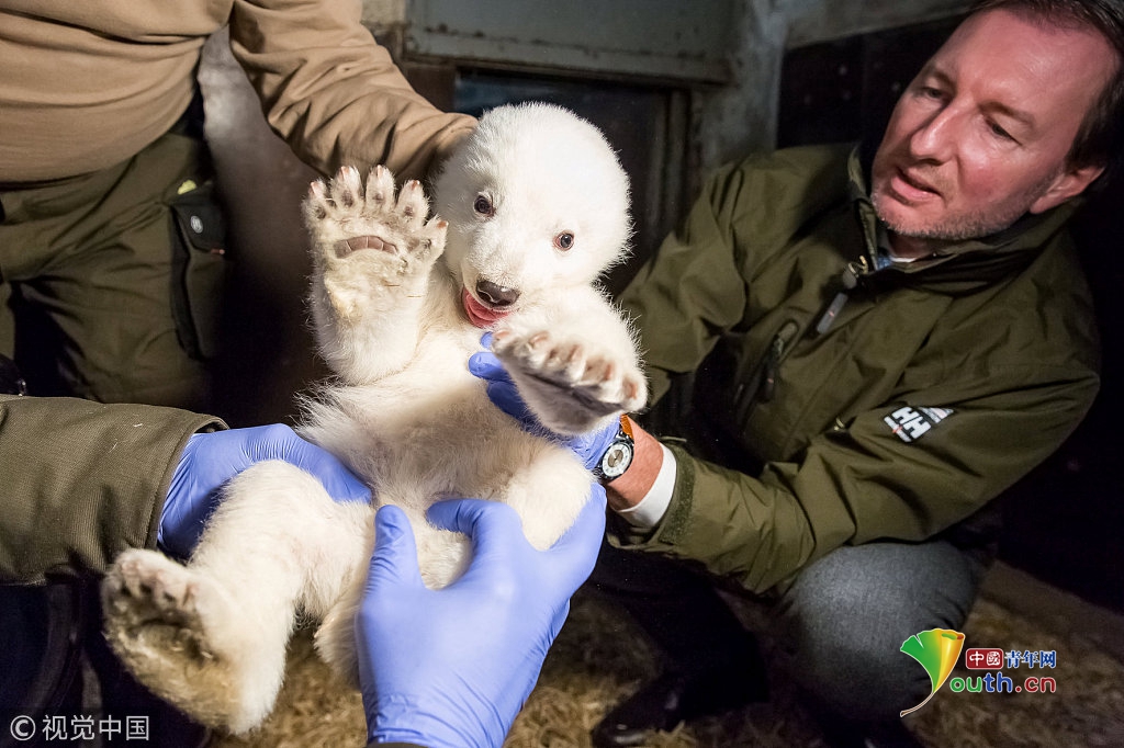 當(dāng)?shù)貢r(shí)間2017年1月12日,德國柏林,柏林蒂爾加滕動物園為一只雄性北極熊寶寶檢查身體。熊寶寶于2016年11月3日出生,身高67厘米,體重4.6千克。