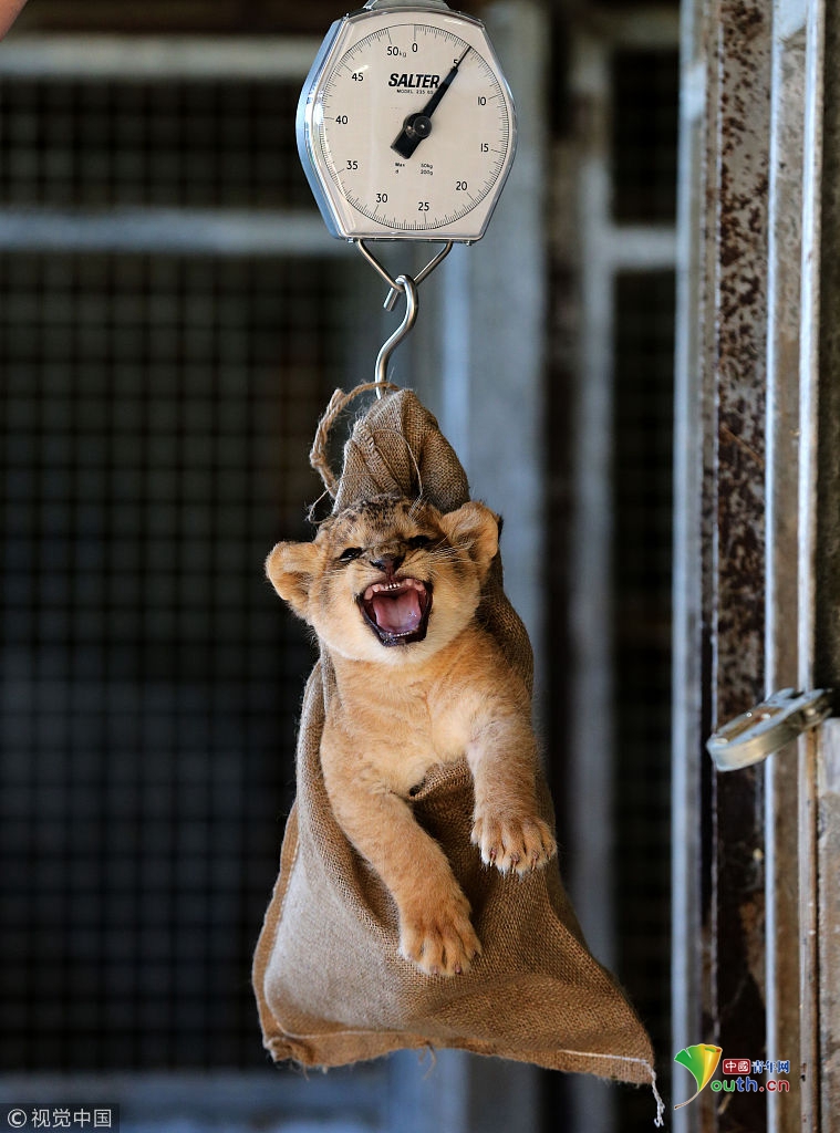 當(dāng)?shù)貢r(shí)間2013年10月10日,英國蘇格蘭斯特靈,Blair Drummond Safari野生動物園一頭新生獅子幼崽進(jìn)行稱重。它僅有一個(gè)月大。