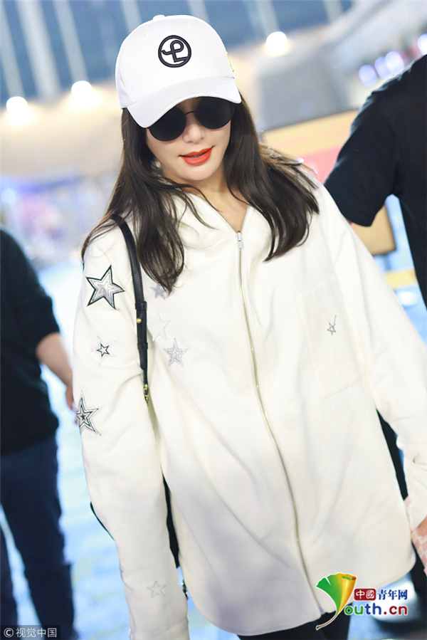 11月29日,上海,秦嵐現(xiàn)身機(jī)場。她戴白色鴨舌帽,穿白色星星圖案外套配微喇牛仔褲,架黑超涂紅唇笑靨如花。